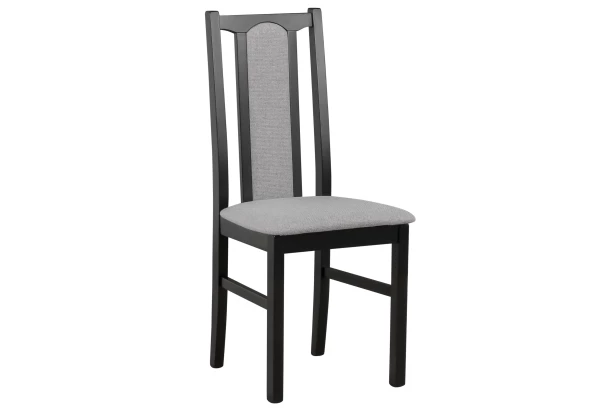 Klasická jedálenská stolička v elegantnom štýle má stabilnú konštrukciu z masívneho bukového dreva a čierny povrch. Polstrovaný sedák je potiahnutý odolnou tkaninou vo farbe šedá.