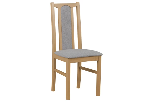Klasická jedálenská stolička v elegantnom štýle má stabilnú konštrukciu z masívneho bukového dreva a povrch morený na dekor dub grandson. Polstrovaný sedák je potiahnutý odolnou tkaninou vo farbe šedá.