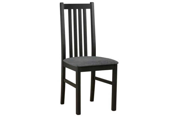 Klasická jedálenská stolička s vysokým operadlom sa hodí do každej kuchyne a jedálne. Stolička má stabilnú konštrukciu z masívneho bukového dreva a čierny povrch. Polstrovaný sedák je potiahnutý látkou vo farbe tmavo šedá, ktorá je odolná voči oderu.