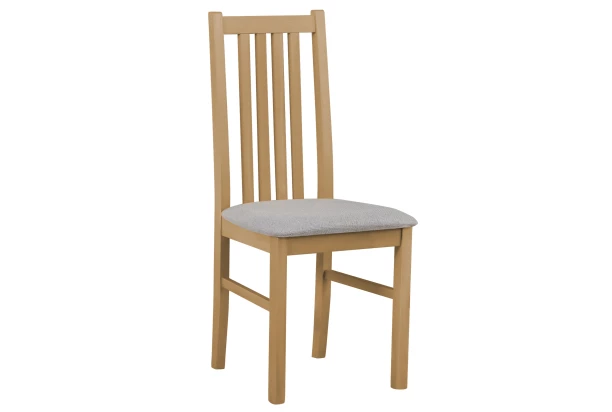 Klasická jedálenská stolička s vysokým operadlom pasuje do každej kuchyne a jedálne. Stabilná konštrukcia z masívneho dreva v dekore dub grandson a sedák vo farbe šedá.