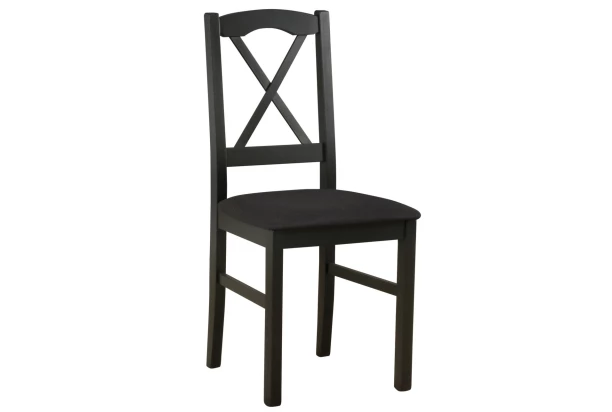 Jedálenská stolička s vysokým operadlom v rustikálnom štýle má stabilnú konštrukciu z masívneho bukového dreva a čierny povrch. Polstrovaný sedák je potiahnutý látkou vo farbe čierna, ktorá sa vyznačuje vysokou odolnosťou voči oderu.