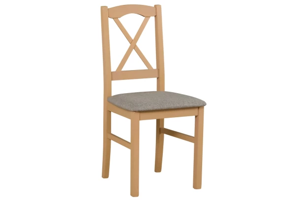Jedálenská stolička s vysokým operadlom v rustikálnom štýle má stabilnú konštrukciu z masívneho bukového dreva a povrch morený na dekor dub sonoma. Polstrovaný sedák je potiahnutý látkou vo farbe šedo-béžová, ktorá je odolná voči oderu.