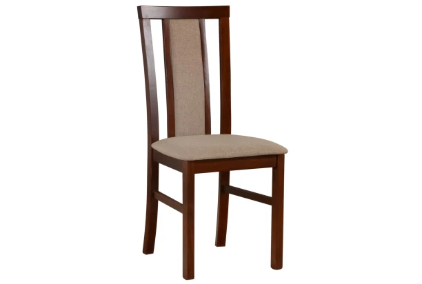 Klasická jedálenská stolička v elegantnom štýle sa hodí do každej kuchyne a jedálne. Stolička má stabilnú konštrukciu z masívneho bukového dreva a povrch morený na dekor hnedý orech. Sedák a stredová časť operadla sú potiahnuté tkaninou vo farbe béžovo-hnedá.