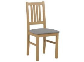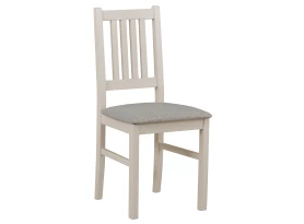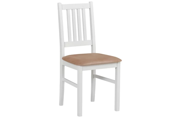 Klasická jedálenská stolička má vysoké operadlo a univerzálne sa hodí do mnohých rôznych kuchýň a jedální. Táto stolička má pevnú konštrukciu vyrobenú z masívneho bukového dreva a biely povrch. Polstrovaný sedák je potiahnutý mäkkou látkou vo farbe béžová, ktorá je príjemná na dotyk a zároveň odolná voči oderu a rozliatiu kvapalín.