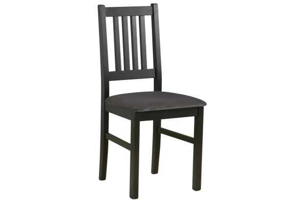 Klasická jedálenská stolička má vysoké operadlo a univerzálne sa hodí do mnohých rôznych kuchýň a jedální. Táto stolička má pevnú konštrukciu vyrobenú z masívneho bukového dreva a čierny povrch. Polstrovaný sedák je potiahnutý mäkkou látkou zamatového vzhľadu vo farbe tmavo šedá, ktorá sa vyznačuje vysokou odolnosťou voči oteru a žmolkovaniu.