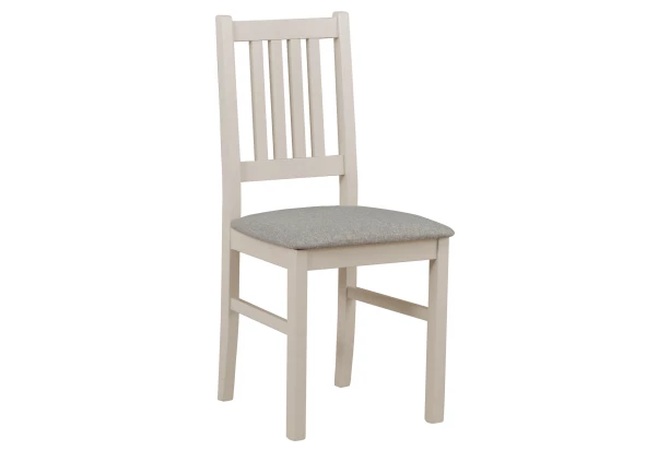 Klasická jedálenská stolička má vysoké operadlo a univerzálne sa hodí do mnohých rôznych kuchýň a jedální. Táto stolička má pevnú konštrukciu vyrobenú z masívneho bukového dreva a povrch vo farbe béžová kašmír. Polstrovaný sedák je potiahnutý látkou vo farbe šedo-béžová, ktorá je odolná voči oderu.