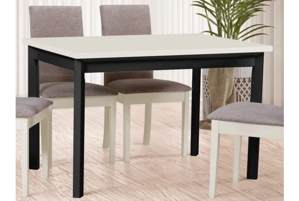 Klasický jedálenský stôl s veľkosťou 120×80 cm v kombinácii farby béžový kašmír/čierna má obdĺžnikovy tvar a hodí sa do každej kuchyne a jedálne. Tento stôl má podnož vyrobenú z masívneho bukového dreva, ktorá mu dodáva pevnosť a stabilitu.