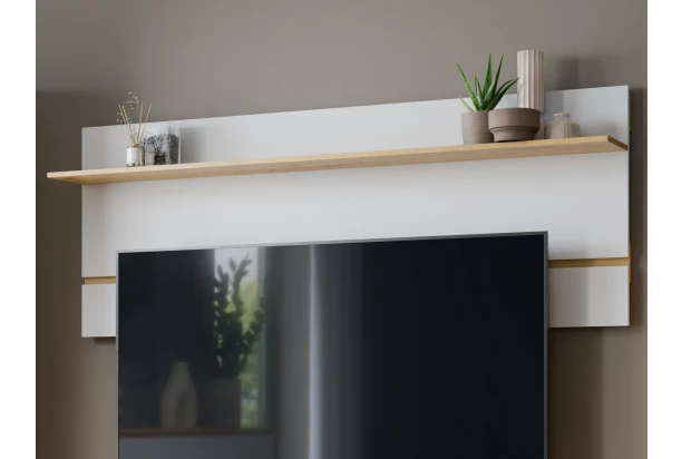 Nástenný panel s policou z kolekcie Foggia – nábytok v modernom minimalistickom štýle kombinuje nadčasovú alpskú bielu s útulným drevodekorom dub artisan, čím vytvára harmonický celok vhodný nielen do obývacej izby. Tento panel na stenu o šičke 188 cm vytvorí elegantnú atmosféru v interiéri a zároveň prakticky poslúži v každej domácnosti. Na poličku môžete vystaviť napríklad svoje obľúbené dekorácie.