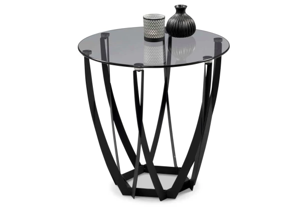 Okrúhly stolík s priemerom 50 cm má hornú plochu z dymovo šedého skla. Stolík zaujme na pohľad moderným dizajnom konštrukcie z čierneho kovu av interiéri pôsobí veľmi vzdušne. Dobre poslúži nielen vedľa sedačky, ale aj kdekoľvek v priestore na všestranné odkladanie vecí.