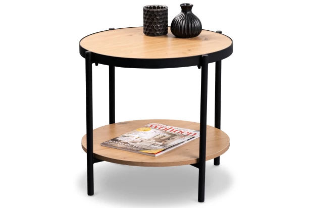 Okrúhly stolík s priemerom 46 cm je vyrobený v drevodekore dub artisan v kombinácii s čiernym kovovým rámom, ktorý dotvára modernú optiku a zároveň zaisťuje stabilitu. Tento menší stolík môžete využiť priamo pri sedačke ako malý konferenčný stolík alebo kdekoľvek priestoru na akékoľvek odkladanie.
