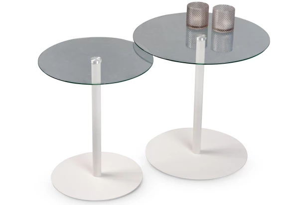 Súprava 2 kusov moderných stolíkov z kombinácie bieleho kovu a číreho skla bude v obývačke pôsobiť vzdušným dojmom. Rôzne veľké stolíky môžu tvoriť vedľa seba spoločnú kompozíciu alebo byť rozmiestnené samostatne v priestore.