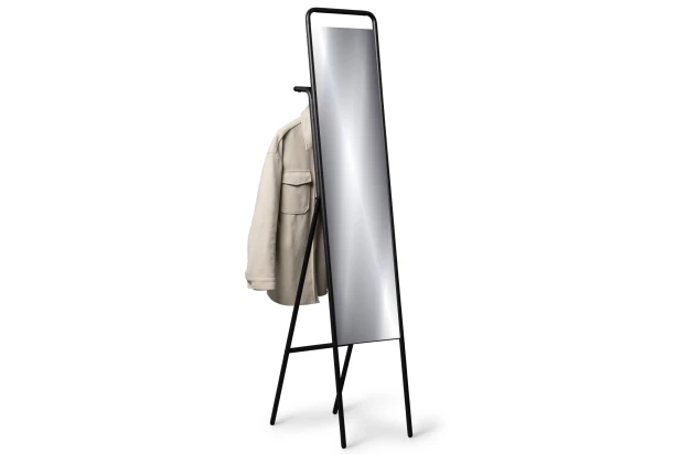 Praktické stojacie zrkadlo s čiernou konštrukciou z kovu je stabilné a zo zadnej strany nájdete závesnú šatníkovú tyč na odkladanie oblečenia alebo šatníkových doplnkov. Zrkadlo využijete nielen v predsieni a šatni, ale aj v spálni, kde bude dobre vyzerať a zároveň prakticky slúžiť.