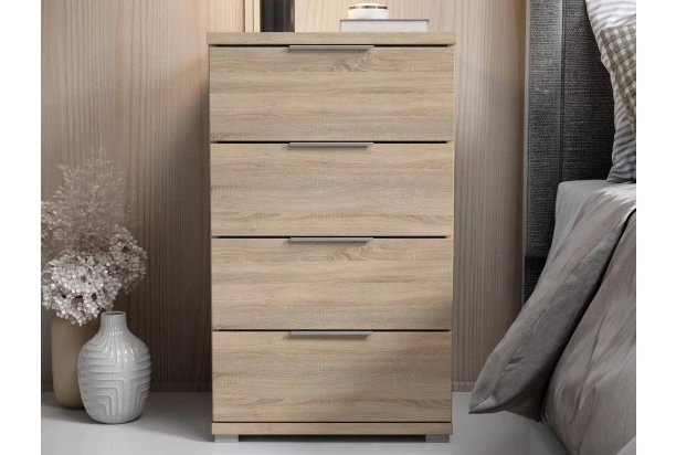 Vysoký nočný stolík/skrinka so 4 zásuvkami v modernom minimalistickom štýle pôsobí nadčasovo. Má celkovú výšku 79 cm a je vyrobený v dekore dub sonoma. Hodí sa kombinovať k posteliam s extra vysokým lôžkom, prípadne prakticky poslúži aj ako samostatná skrinka kdekoľvek v miestnosti.