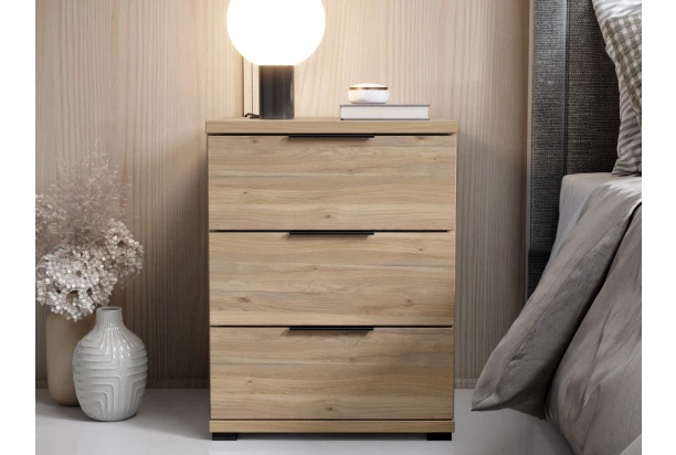 Nočný stolík s 3 zásuvkami v modernom minimalistickom štýle pôsobí nadčasovo. Tento stolík k posteli má celkovú výšku 61 cm a je vyrobený v dekore dub mauvella. Hodí sa kombinovať k posteliam s vyšším lôžkom.