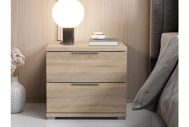 Nočný stolík s 2 zásuvkami v modernom minimalistickom štýle pôsobí nadčasovo. Tento stolík k posteli má celkovú výšku 43 cm a je vyrobený v dekore dub sonoma. Hodí sa kombinovať k posteliam so štandardnou výškou lôžka.