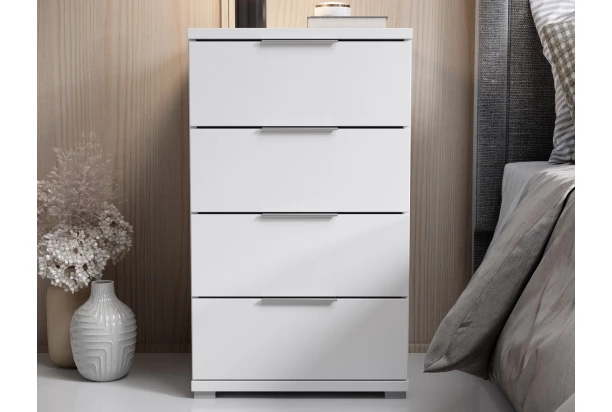 Vysoký nočný stolík/skrinka so 4 zásuvkami v modernom minimalistickom štýle pôsobí nadčasovo. Má celkovú výšku 79 cm a je vyrobený v bielej farbe. Hodí sa kombinovať k posteliam s extra vysokým lôžkom, prípadne prakticky poslúži aj ako samostatná skrinka kdekoľvek v miestnosti.