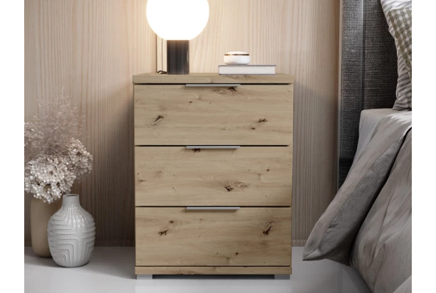 Nočný stolík s 3 zásuvkami v modernom minimalistickom štýle pôsobí nadčasovo. Tento stolík k posteli má celkovú výšku 61 cm a je vyrobený v dekore dub artisan. Hodí sa kombinovať k posteliam s vyšším lôžkom.