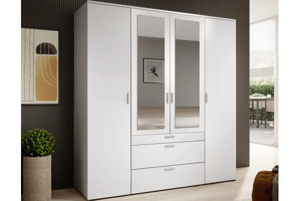 Šatníková skriňa so zrkadlami má šírku 180 cm a ponúka úložné priestory za 4 otočnými dverami a v 3 zásuvkách. Horná zásuvka má praktické členenie na prehľadné uloženie drobnej bielizne alebo doplnkov. Skriňa je vyrobená v bielej farbe a poslúži v spálni, detskej izbe, chodbe alebo napríklad aj predsieni.