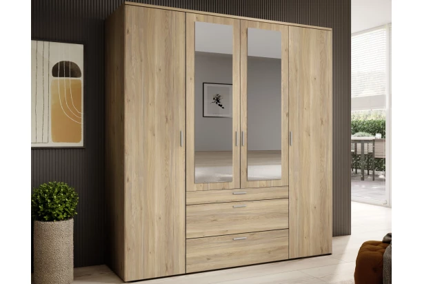Šatníková skriňa so zrkadlami má šírku 180 cm a ponúka úložné priestory za 4 otočnými dverami a v 3 zásuvkách. Horná zásuvka má praktické členenie pre prehľadné uloženie drobnej bielizne alebo doplnkov.