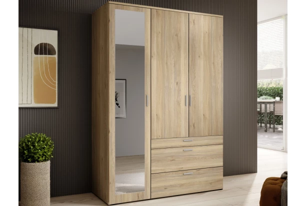 Šatníková skriňa so zrkadlom má šírku 135 cm a ponúka úložné priestory za 3 otočnými dverami a v 3 zásuvkách. Horná zásuvka má praktické členenie na prehľadné uloženie drobnej bielizne alebo doplnkov. Skriňa je vyrobená v dekore dub mauvella a poslúži v spálni, detskej izbe, chodbe alebo napríklad aj predsieni.