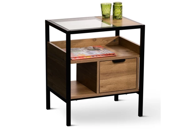 Odkladací/nočný stolík so zásuvkou má moderný rám z čierno lakovaného kovu v kombinácii s dubovým drevodekorom a tvrdeným čírym sklom. Ideálne sa hodí do moderného bytu.