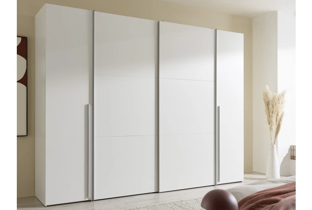 Moderná šatníková skriňa so šírkou 267 je vyrobená v bielej farbe a ponúka praktickú kombináciu otočných a posuvných dverí. Vo vnútornom priestore skrine nájdete police na prehľadné ukladanie oblečenia i kovové šatníkové tyče.