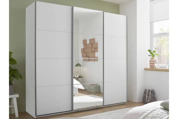 Moderná šatníková skriňa s 3 posuvnými dverami a zrkadlom uprostred poslúži prakticky v každej spálni, šatni alebo chodbe nielen na ukladanie oblečenia. Skriňa s celkovou šírkou 215 cm má vnútorné úložné priestory, ktoré obsahujú šatníkové tyče, police aj zabudovaný element s 3 zásuvkami, do ktorých môžete prehľadne ukladať drobnú bielizeň alebo doplnky.