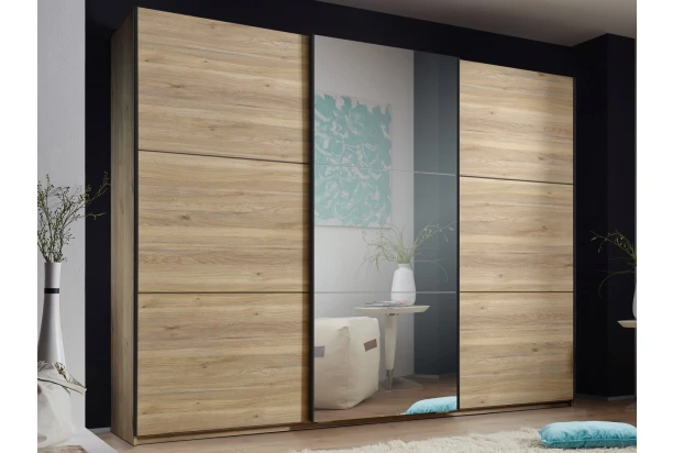 Veľká šatníková skriňa so zrkadlom je vyrobená v útulnom drevodekore dub mauvella a má celkovú šírku 270 cm. Za posuvnými dverami nájdete priestranné úložné priestory so šatníkovými tyčami a hornými policami. Skriňa poslúži na všestranné ukladanie vecí nielen v spálni, ale aj napríklad v chodbe alebo predsieni. Veľká zrkadlová plocha opticky zväčší okolitý priestor v miestnosti. Vnútorný priestor vo vnútri skrine môžete navyše doplniť ešte ďalšími policami podľa vašej potreby. Bočnú konštrukciu skrine je možné navyše doplniť okrasným paspartovým rámom.