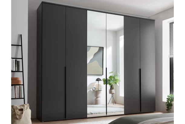 Šatníková skriňa so zrkadlami má celkovú šírku 270 cm a moderný štýl so zvislými úchytmi. Táto grafitová šedá skriňa za 6 otočnými dverami ponúka úložné priestory so šatníkovými tyčami a policami. Skriňa dobre poslúži v modernom priestore spálne, v šatni alebo komore pre všestranné ukladanie. Vnútorné priestory môžete navyše doplniť ďalšími policami v prípade potreby.