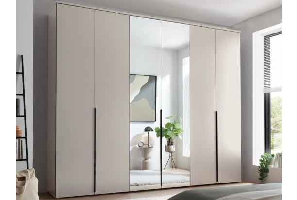 Šatníková skriňa so zrkadlami má celkovú šírku 270 cm a moderný štýl so zvislými úchytmi. Táto kašmírovo béžová skriňa za 6 otočnými dverami ponúka úložné priestory so šatníkovými tyčami a policami. Skriňa dobre poslúži v modernom priestore spálne, v šatni alebo komore pre všestranné ukladanie. Vnútorné priestory môžete navyše doplniť ďalšími policami v prípade potreby.