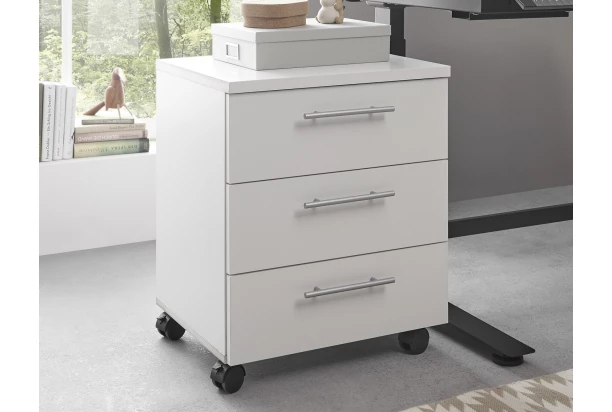 Univerzálny úložný kontajner na kolieskach v bielej farbe má 3 zásuvky a môžete ho umiestniť priamo k písaciemu stolu alebo ho využiť samostatne kdekoľvek v miestnosti ako malú úložnú skrinku. Kolieska s aretačným mechanizmom udržia kontajner na svojom mieste.