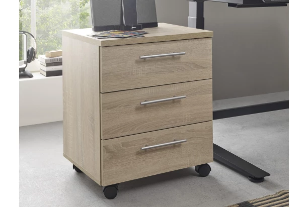 Univerzálny úložný kontajner na kolieskach v dekore dub sonoma má 3 zásuvky a môžete ho umiestniť priamo k písaciemu stolu alebo ho využiť samostatne kdekoľvek v miestnosti ako malú úložnú skrinku. Kolieska s aretačným mechanizmom udržia kontajner na svojom mieste.