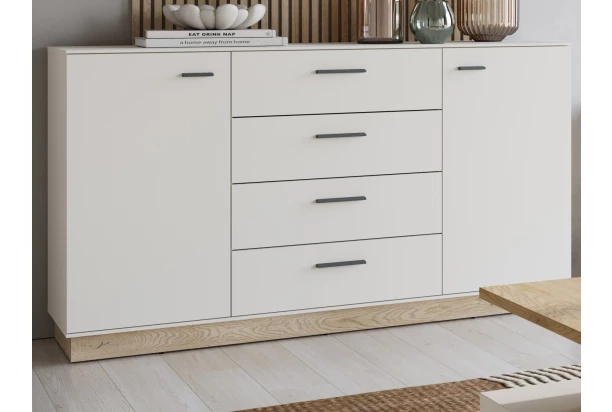 Široká komoda so zásuvkami z programu Meolo so šírkou 155 cm je vyrobená v útulnej kombinácii dub cremona/béžový kašmír. Táto kombinovaná komoda dodá vášmu domovu moderný a zároveň hrejivý vzhľad a hodí sa do akéhokoľvek interiéru. Vďaka praktickému usporiadaniu so zásuvkami ponúka dostatok úložného priestoru pre všetky vaše veci.