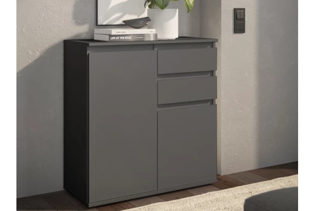 Skrinka s 2 šuplíkmi z radu Brest – nábytok v jednoducho modernom štýle má nadčasový look a zároveň praktické využitie kdekoľvek v byte. Skrinka so šírkou 80 cm je vyrobená v antracitovo šedej farbe.