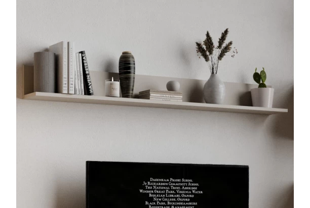 Police na stenu z radu Asko Living – nábytok v modernom minimalistickom štýle je nadčasový a zároveň plní svoj praktický účel. Polica s nástenným panelom má šírku 135 cm a je vyrobená vo farbe béžová kašmír.
