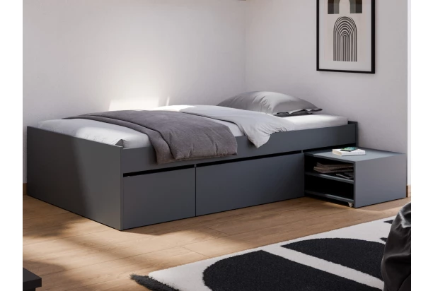 Posteľ o veľkosti lôžka 120×200 cm je veľmi praktická, pretože obsahuje výsuvné úložné zásuvky a výsuvný nočný stolík s priehradkami, do ktorých môžete odkladať napríklad knižky, časopisy a ďalšie veci, ktoré chcete mať pri posteli po ruke. Posteľ je vyrobená v antracitovo šedom prevedení. Univerzálnym minimalistickým štýlom pasuje do izby pre všetkých vekových generácií – od detí, cez teenagerov až po dospelých. Úložné zásuvky sú na kolieskach a vysúvanie je tak veľmi jednoduché.