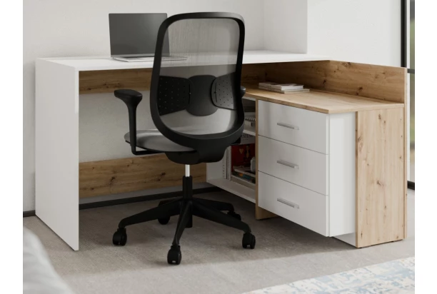 Moderný rohový písací stôl v kombinácii dub artisan/biely obsahuje praktické zásuvky aj odkladacie priehradky, kam umiestnite napríklad knižky alebo šanóny. Svojím moderným dizajnom sa hodí pre umiestnenie do pracovne, študentskej izby aj detskej izbičky.