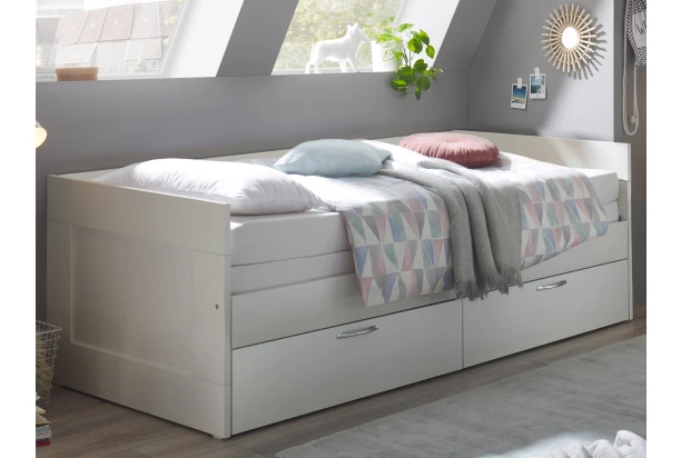 Rozkladacia posteľ so zásuvkami z univerzálneho spálňového programu Leporolo – nábytok pre všetky vekové generácie, deti, teenagerov, dospelých aj seniorov. Klasický elegantný štýl v prevedení biela mat s charakteristickým orámovaním zásten sa hodí do akéhokoľvek interiéru. Táto skvelá praktická posteľ obsahuje rošt aj úložné zásuvky, kam môžete uschovať napríklad lôžkoviny alebo veci sezónnej potreby. Posteľ môže využiť cez deň aj ako pohovku, cez noc poslúži ako klasická jednolôžková posteľ na každodenné spanie. Pokiaľ však príde návštevu, tak ju možno rozložiť na dvojlôžko pre príležitostné spanie. S touto praktickou posteľou tak získate pre svoj domov veľmi praktický kus nábytku, ktorý využijete nielen v spálni, ale napríklad aj v hosťovskej izbe alebo napríklad pracovne.