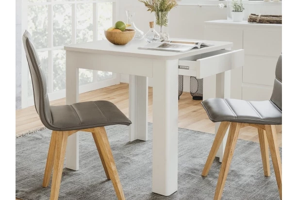 Štvorcový jedálenský stôl s veľkosťou 80×80 cm má elegantne zaoblené hrany av bočnom ráme ukrýva praktický úložný šuplík, kam môžete uschovať napríklad prestieranie, zošit s písacími potrebami alebo ďalšie veci, ktoré chcete mať po ruke priamo pri stole. Štvorcový stôl má stabilnú zosilnenú konštrukciu a je vyrobený v univerzálnej bielej farbe. Rozmerovo pasuje aj do malého priestoru jedálne alebo kuchyne.