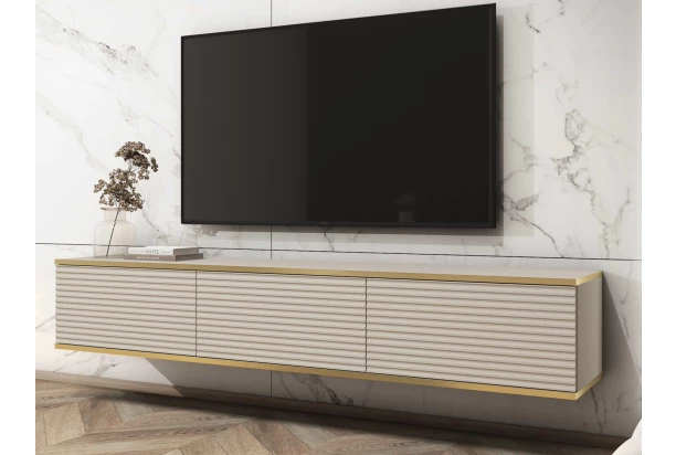 Závesná TV skrinka so šírkou 175 cm v béžovej farbe skvele doplní moderne zariadený interiér. Plochy skrinky dopĺňa zaujímavá horizontálna štruktúra a línia zlatého orámovania, vďaka ktorým skrinka pôsobí luxusne. Tento štýlový televízny stolík je navyše veľmi praktický – vďaka zaveseniu na stenu šetrí priestor, uľahčuje upratovanie podlahy a navyše pôsobí v miestnosti vzdušne. Ideálna voľba pre tých, kde hľadajú kombináciu funkčnosti a štýlového designu.