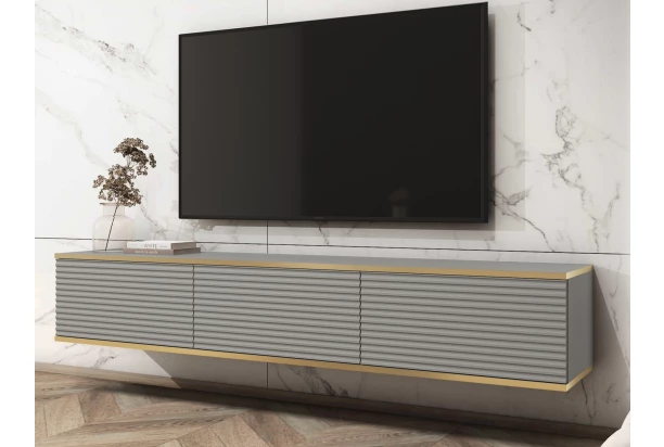 Závesná TV skrinka so šírkou 175 cm v šedej farbe skvele doplní moderne zariadený interiér. Plochy skrinky dopĺňa zaujímavá horizontálna štruktúra a línia zlatého orámovania, vďaka ktorým skrinka pôsobí luxusne. Tento štýlový televízny stolík je navyše veľmi praktický – vďaka zaveseniu na stenu šetrí priestor, uľahčuje upratovanie podlahy a navyše pôsobí v miestnosti vzdušne. Ideálna voľba pre tých, kde hľadajú kombináciu funkčnosti a štýlového designu.