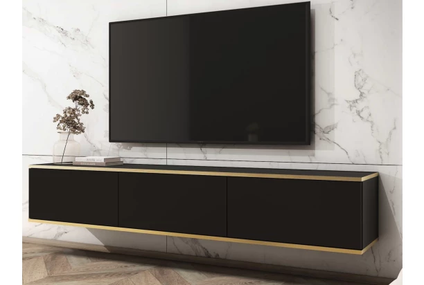 Závesná TV skrinka so šírkou 175 cm v čiernej farbe skvelo doplní moderne zariadený interiér. Plochy skrinky dopĺňajú línie zlatého orámovania, vďaka ktorým pôsobia luxusne. Tento štýlový televízny stolík je navyše veľmi praktický – vďaka zaveseniu na stenu šetrí priestor, uľahčuje upratovanie podlahy a navyše pôsobí v miestnosti vzdušne. Ideálna voľba pre tých, kde hľadajú kombináciu funkčnosti a štýlového designu.