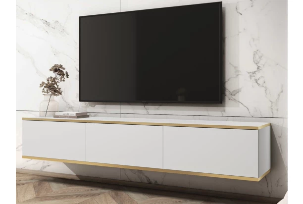 Závesná TV skrinka so šírkou 175 cm v bielej farbe skvelo doplní moderne zariadený interiér. Plochy skrinky dopĺňajú línie zlatého orámovania, vďaka ktorým pôsobia luxusne. Tento štýlový televízny stolík je navyše veľmi praktický – vďaka zaveseniu na stenu šetrí priestor, uľahčuje upratovanie podlahy a navyše pôsobí v miestnosti vzdušne. Ideálna voľba pre tých, kde hľadajú kombináciu funkčnosti a štýlového designu.