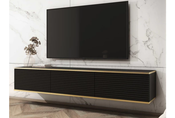 Závesná TV skrinka so šírkou 175 cm v čiernej farbe skvelo doplní moderne zariadený interiér. Plochy skrinky dopĺňa zaujímavá horizontálna štruktúra a línia zlatého orámovania, vďaka ktorým skrinka pôsobí luxusne. Tento štýlový televízny stolík je navyše veľmi praktický – vďaka zaveseniu na stenu šetrí priestor, uľahčuje upratovanie podlahy a navyše pôsobí v miestnosti vzdušne. Ideálna voľba pre tých, kde hľadajú kombináciu funkčnosti a štýlového designu.