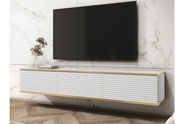 Závesná TV skrinka so šírkou 175 cm v bielej farbe skvelo doplní moderne zariadený interiér. Plochy skrinky dopĺňa zaujímavá horizontálna štruktúra a línia zlatého orámovania, vďaka ktorým skrinka pôsobí luxusne. Tento štýlový televízny stolík je navyše veľmi praktický – vďaka zaveseniu na stenu šetrí priestor, uľahčuje upratovanie podlahy a navyše pôsobí v miestnosti vzdušne. Ideálna voľba pre tých, kde hľadajú kombináciu funkčnosti a štýlového designu.