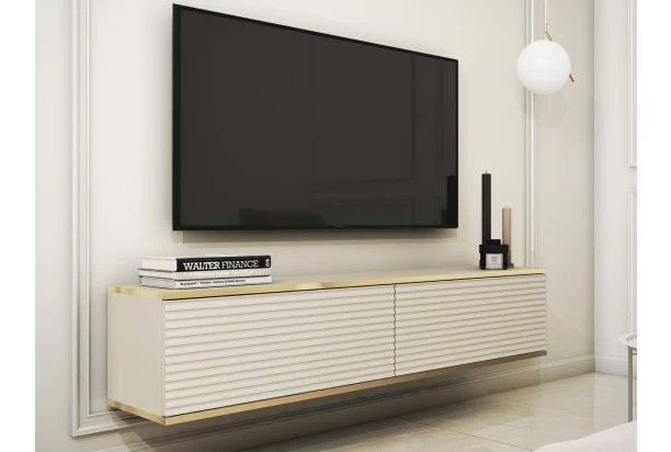 Závesná TV skrinka so šírkou 135 cm v béžovej farbe skvele doplní moderne zariadený interiér. Plochy skrinky dopĺňa zaujímavá horizontálna štruktúra a línia zlatého orámovania, vďaka ktorým skrinka pôsobí luxusne. Tento štýlový televízny stolík je navyše veľmi praktický – vďaka zaveseniu na stenu šetrí priestor, uľahčuje upratovanie podlahy a navyše pôsobí v miestnosti vzdušne. Ideálna voľba pre tých, kde hľadajú kombináciu funkčnosti a štýlového designu.