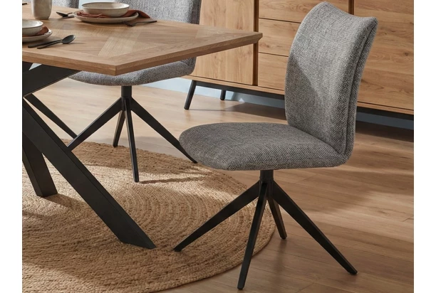 Jedálenská stolička v elegantnom modernom štýle má pohodlne zaoblené operadlo, otočný sedák a čiernu kovovú podnož. Očalúnená tkaninou vo farbe holubia šedá. Stolička sa bude dokonale hodiť do moderne zariadenej jedálne, kde vynikne.