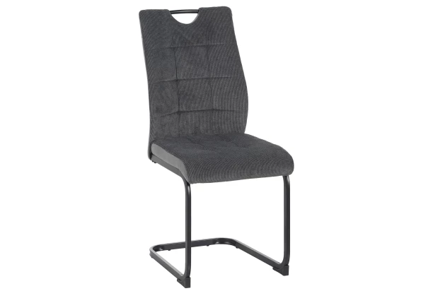 Komfortná jedálenská stolička na čiernej kovovej podnoži má elegantný štvorcový prešiv a je očalúnená dymovo šedou štruktúrovanou látkou v kombinácii so šedou látkou v optike kože, ktorá je príjemne mäkká na dotyk a zároveň pôsobí zaujímavo na pohľad. Kovové madlo v hornej časti operadla uľahčuje manipuláciu pri odsúvaní stoličky od stola.