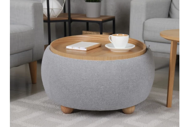 Skvelý okrúhly taburet má flexibilný horný sedák, ktorý sa po ľahkom pretočení premení na praktický konferenčný stolík s odkladacou plochou v útulnom dekore dreva. Tento nápaditý kus nábytku má parádny štýlový dizajn na okrúhlych nôžkach a prakticky poslúži napríklad vedľa Vášho gauča. Počas dňa poslúži ako odkladacia plocha na občerstvenie a večer ho môžete pretočiť a využiť ako podnožku, prípadne využiť ako ďalšie miesto na sedenie pre Vašu návštevu. Kombinuje teda funkciu taburetu aj stolíka v jednom a môže tak ušetriť aj priestor v miestnosti. Horný sedák s integrovanou odkladacou plochou má navyše látkové madlo pre ľahkú manipuláciu počas pretáčania. Taburet navyše ukrýva aj vnútorný úložný priestor, kam uložíte napríklad noviny, časopisy, domáce papuče alebo ďalšie veci každodennej potreby, ktoré ľahko vyberiete a zase uschováte.