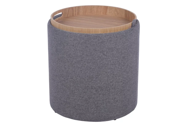 Nápaditý okrúhly taburet má flexibilný horný sedák, ktorý sa po ľahkom pretočení premení na praktický odkladací stolík vo svetlom dekore dreva. Očalúnený látkou vo farbe stredne šedá. Tento nápaditý taburet prakticky poslúži nielen vedľa pohovky v obývačke, ale aj kdekoľvek inde. Počas dňa poslúži ako odkladacia plocha na občerstvenie a večer ho môžete pretočiť a využiť ako podnožku, prípadne využiť ako ďalšie miesto na sedenie pre Vašu návštevu. Získate tak 2 v 1, stolík aj taburet. Horný sedák s integrovanou odkladacou plochou má navyše bočné látkové madlo pre ľahkú manipuláciu počas pretáčania. Vnútri taburetu je aj úložný priestor, kam môžete uschovať drobné veci.